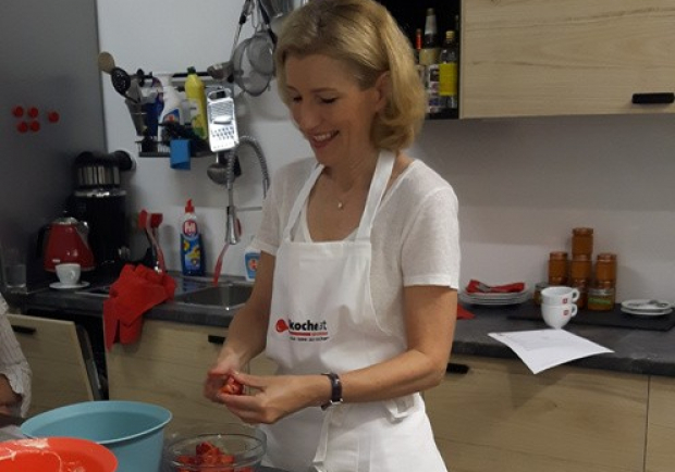 Was soll's, für den Moment sind uns "die Topfhandschuhe gebunden" – wir warten also und widmen uns vorübergehend den Erdbeeren. Während Martina Salomon flinken Fingers die verführerisch duftenden, heimischen Früchtchen putzt und klein schneidet, erzählt Sie von ihrem Bruder: "Der hat sich ein Jahr lang nur mit Rohkost ernährt – wirklich nichts Warmes, ein Wahnsinn!" Unvorstellbar für unsere kleine Genießerrunde: "Das täte mein Magen nicht vertragen, der würd' zwicken und rebellieren!", zeigt sich Brigitta schockiert, Salomon nickt zustimmend: "Ja… wenn ich nix Warmes krieg, bin ich eh schon grantig!"