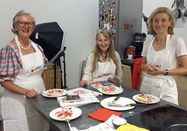 Puh, schwül ist es heute – erhitzt, aber voller Vorfreude trudeln unsere Gewinnerinnen Brigitta (kassandra306) und Leopoldine (Fani1) bei uns ein. Sie freuen sich sichtlich sehr darüber, hier zu sein – wie schön! Bevor wir es uns in unserer kleinen, feinen Redaktionsküche gemütlich machen, wird zunächst in aller Ruhe die ichkoche.at-Redaktion besichtigt, fotografiert und durch unsere prallgefüllten Bücherregale geschmökert. Besondere Entzückung verursacht dabei ein kleiner, kuscheliger ichkoche.at-Polster auf unserer – standesgemäß! – knallroten Begrüßungscouch... Auch unser stetig wachsendes Rezeptrepertoire ist Thema: "Ihr habt immer wieder ganz neue, interessante Sachen auf ichkoche.at! Da kenn ich mich zwar nicht immer aus, aber dann frag ich einfach bei euch nach – und bekomm immer gleich eine nette Antwort!", lobt Leopoldine lachend. Vielen lieben Dank – ein solches Lob macht uns natürlich besonders stolz! Frohen Mutes & knurrenden Magens machen wir uns also auf den Weg in die Küche, wo wir mit Martina Salomon einen ganz besonderen Küchentratsch-Ehrengast begrüßen dürfen…