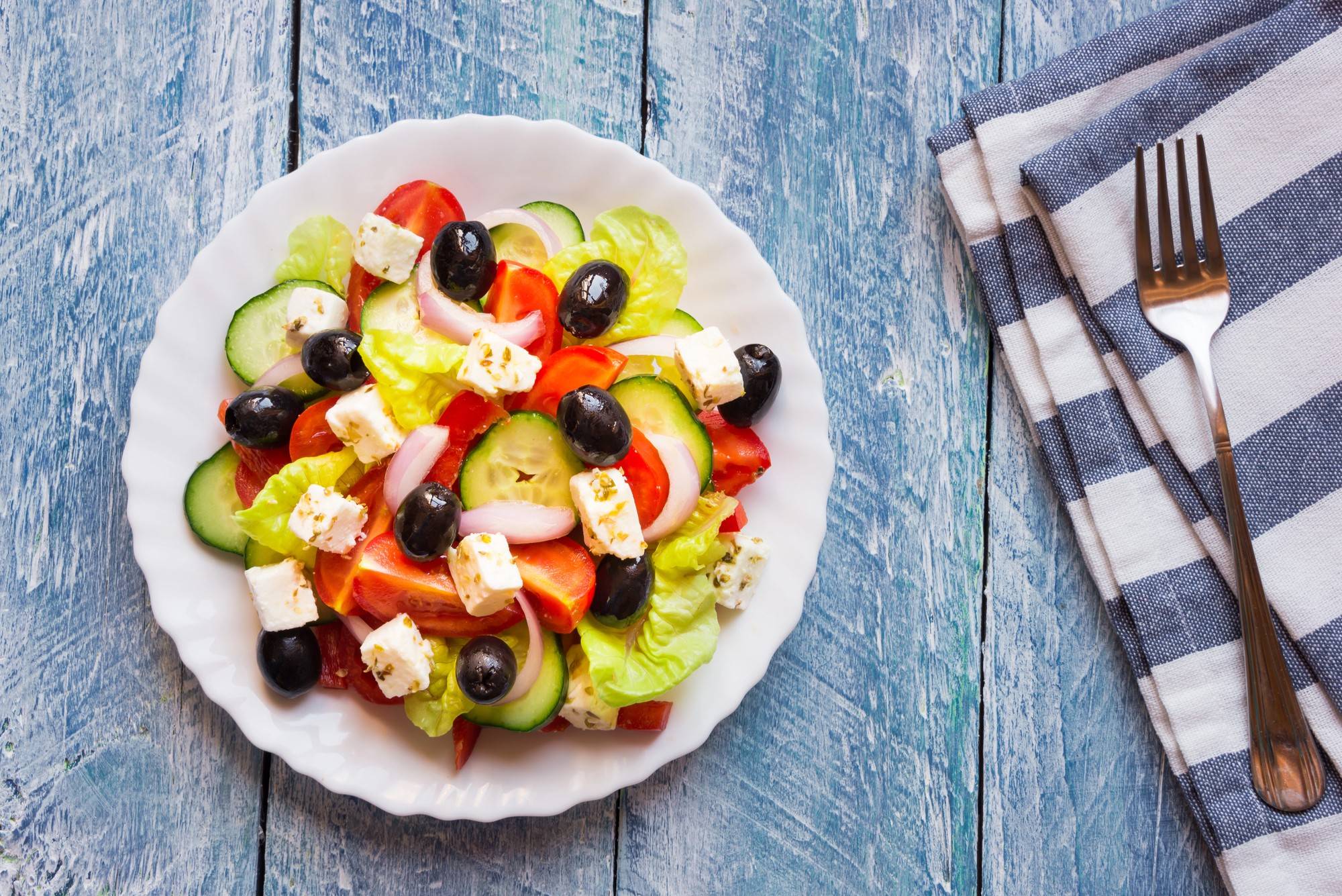 Paradeiser, Gurke und Paprika waschen und in mundgerechte Stücke schneiden. Zwiebel schälen und in Ringe oder Streifen schneiden. Das Gemüse mit den Oliven...