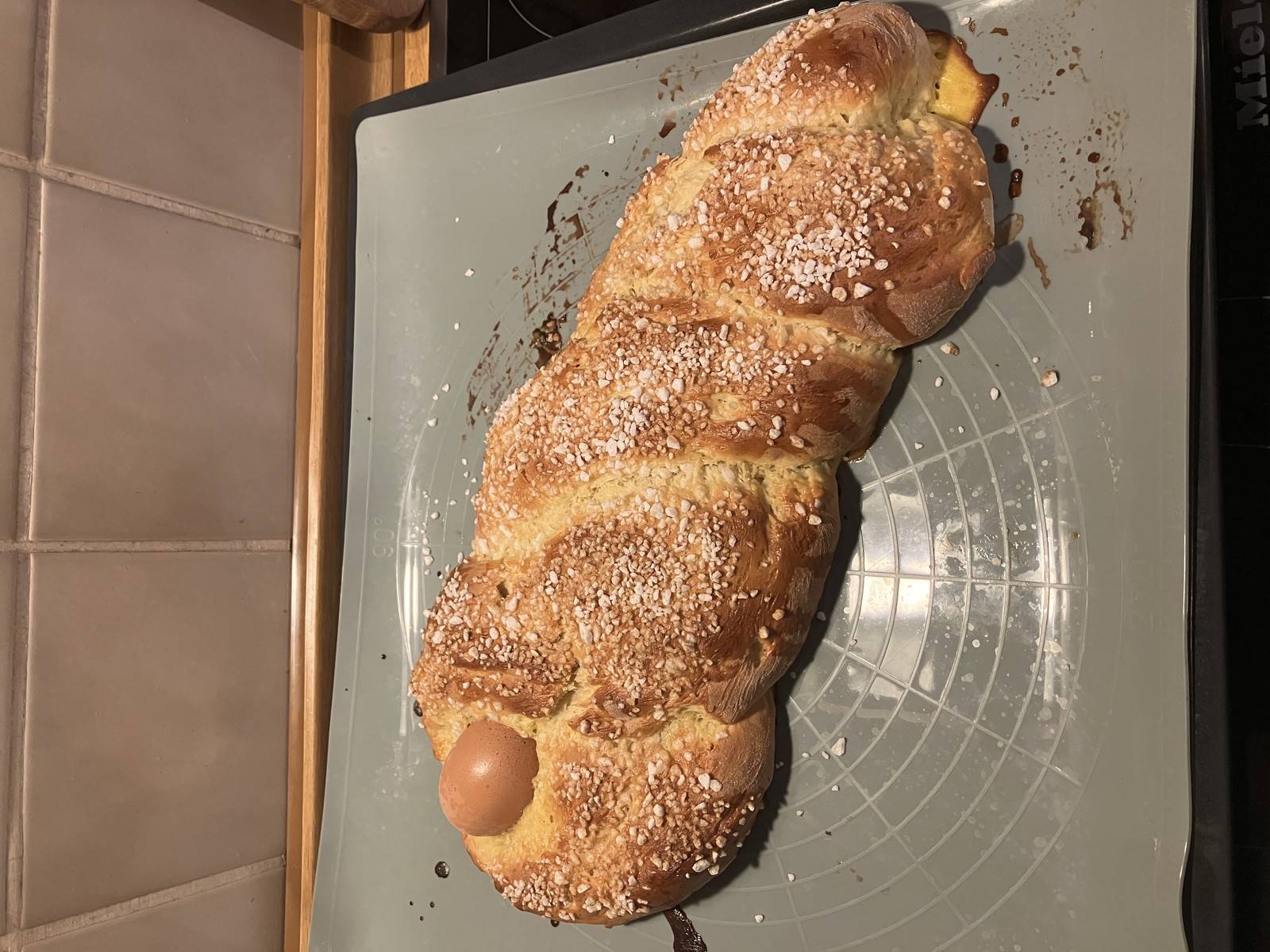 Auf einer bemehlten Arbeitsfläche den Teig in zwei gleich grosse Stücke teilen und zu Teigsträngen von ca. 40 cm formen. Diese dann kreuzförmig übereinander legen, wobei die beiden oberen Enden näher beieinander liegen sollen. In diesen Zwischenraum das Ei einlegen und die Teigstränge rund um das Ei zusammenschlingen. Die zwei unteren Stränge striezelartig weiter flechten.