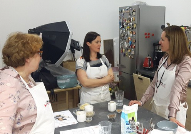 Aus dem Ofen beginnt es bereits zu duften, also Haferflocken in die Schüssel, Sirup dazu, alles verkneten: "Das ist bissl eine patzige Angelegenheit", warnt die Autorin. Kein Problem: Christina rollt, Karin schupft die frisch gewuzelten Glückskugeln gekonnt in Kakao, Kokos und Mandeln.