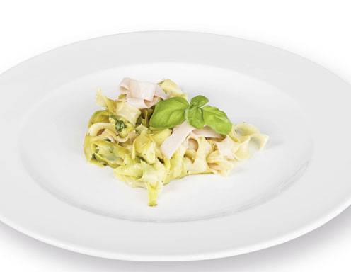 Die Zucchini Bandnudeln und die restlichen Putenbruststreifen darauf platzieren und mit gezupftem Basilikum Farbe geben.