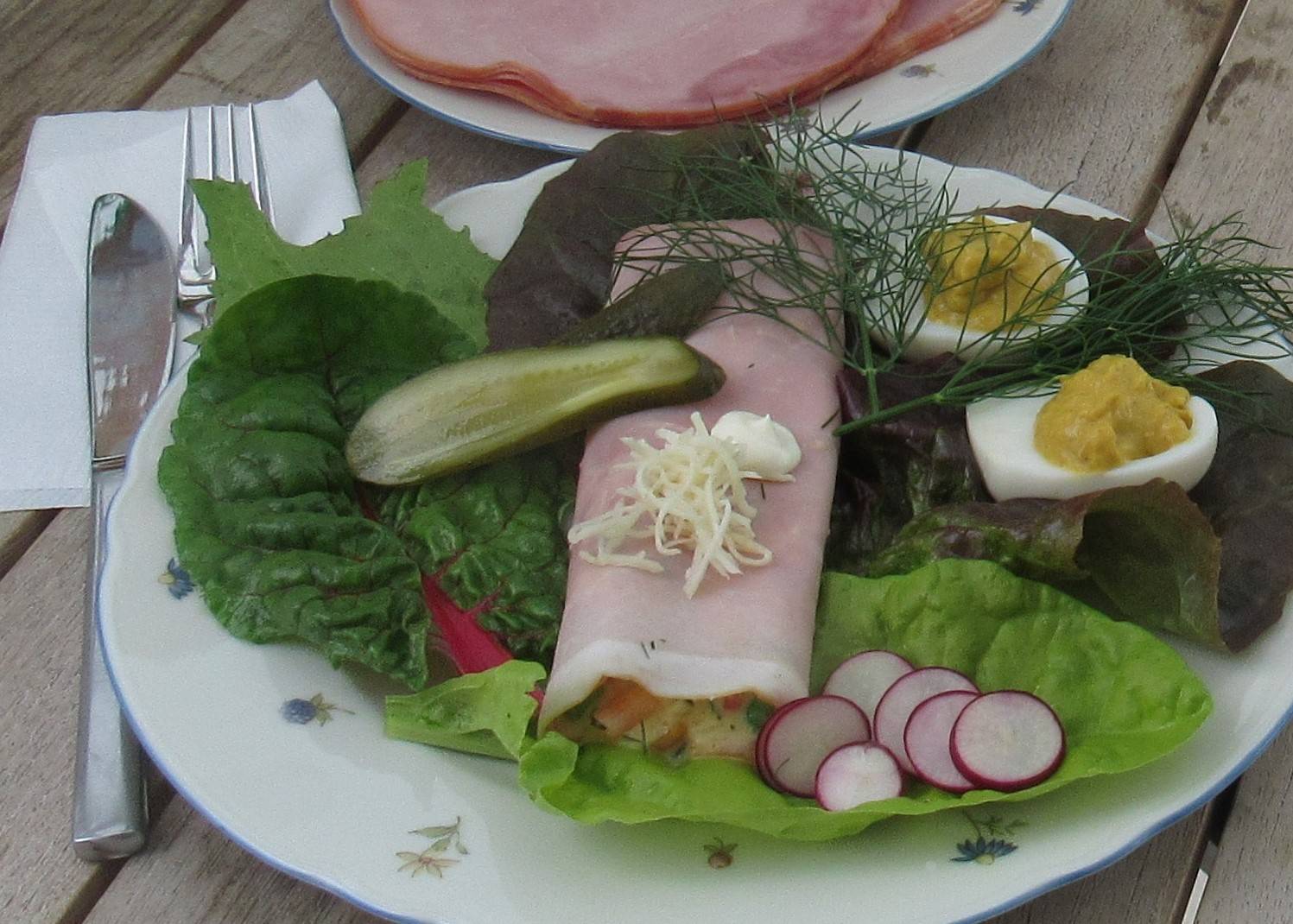 2. Die Kräuter hacken und unterheben. Den Schinken auflegen, mit der Fülle bestreichen, einrollen und auf einem Salatblatt anrichten.