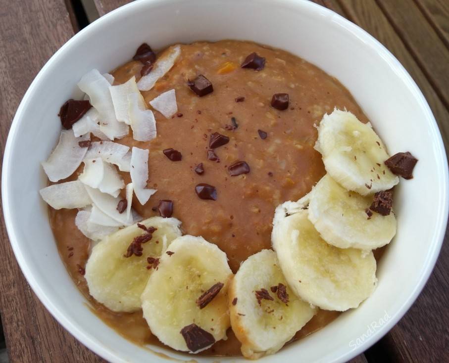 Ich habe weniger Flüssigkeit genommen und noch Marillen klein geschnitten und mit köcheln lassen. Statt der Mandeln, die ich nicht vertrage habe ich Kokoschips genommen. Eine Handvoll Kakaonibs wäre schon sehr viel, also habe ich mich auf einen Teelöffel beschränkt und diese untergerührt und das Ganze noch mit Zartbitterschokolade bestreut. Etwas Zimt wäre auch noch eine gute Idee gewesen.